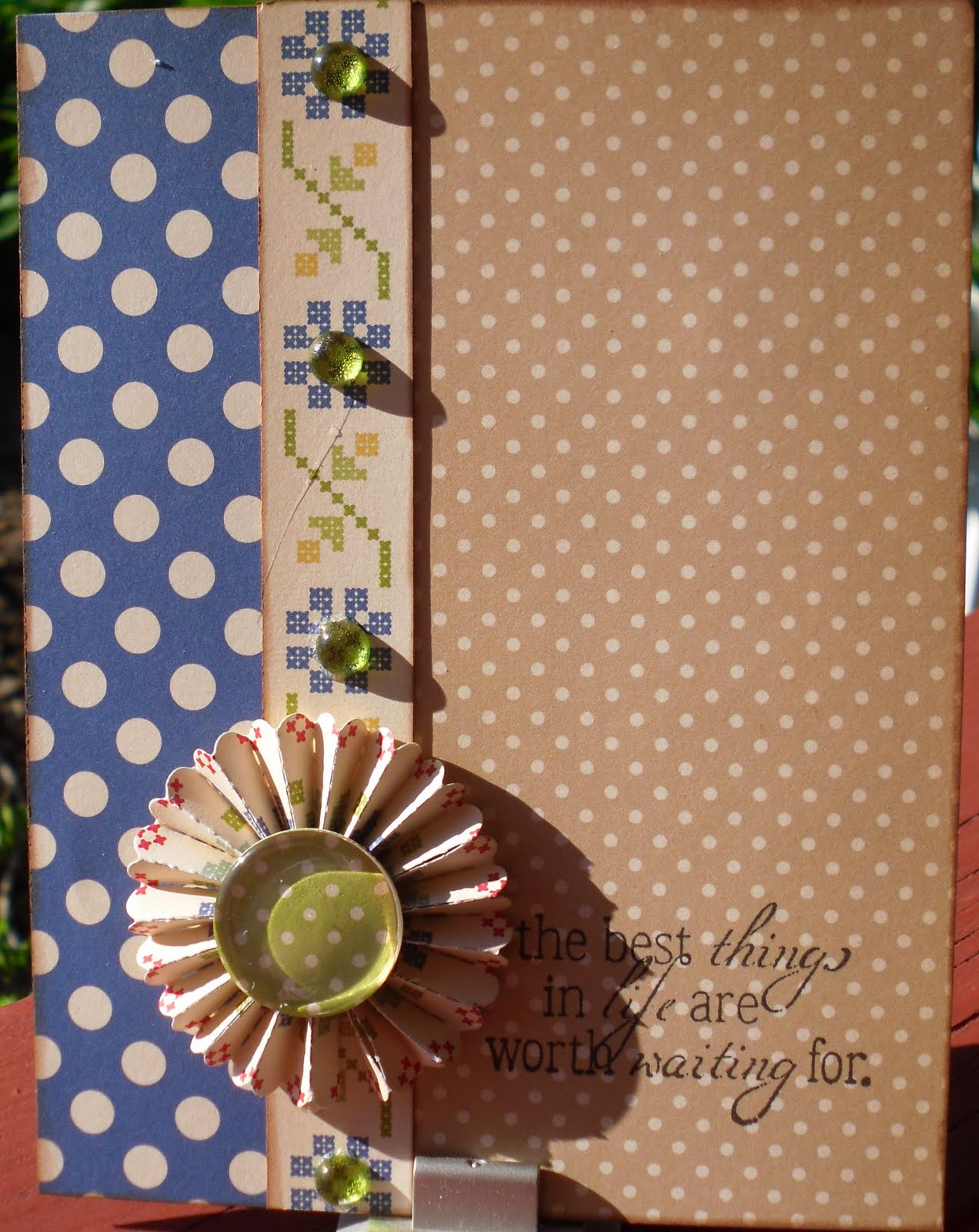For this card I used my scraps of the October Afternoon 5 & Dime collection. I just love this paper and really like the rosette flowers made with the Tim Holtz Mini Rosette die topped with a button made from the Epiphany Round 25. I also accented along the strip with Recollections Mini Round Gems. I also used one of my Ippity stamps from Unity.